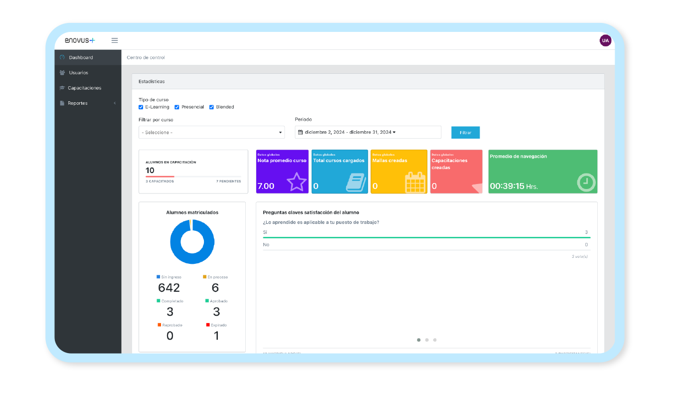 ■ Dashboard Admin: permite monitorear el 100% de las actividades de los alumnos de manera simple, rápida e intuitiva, optimizando la gestión y el impacto de tus programas de capacitación.